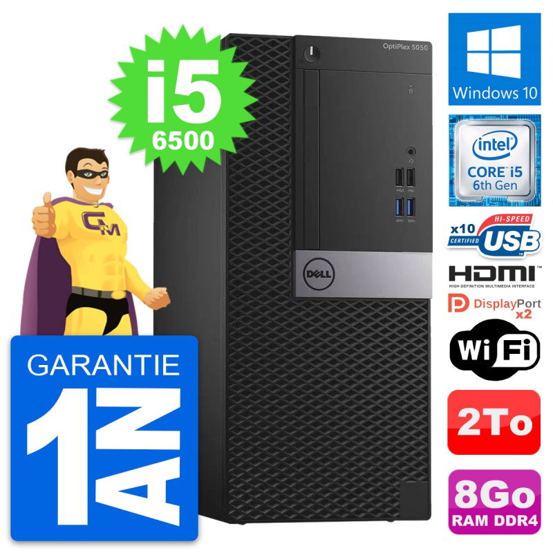 PC Tour Dell OptiPlex 5050 MT - Intel Core i5-6500 3.2 Ghz (6 Mo) - 8 Go DDR4 - Disque Dur 3,5" 2 To - Clef Wifi USB - Windows 10 - Garantie 1 an.