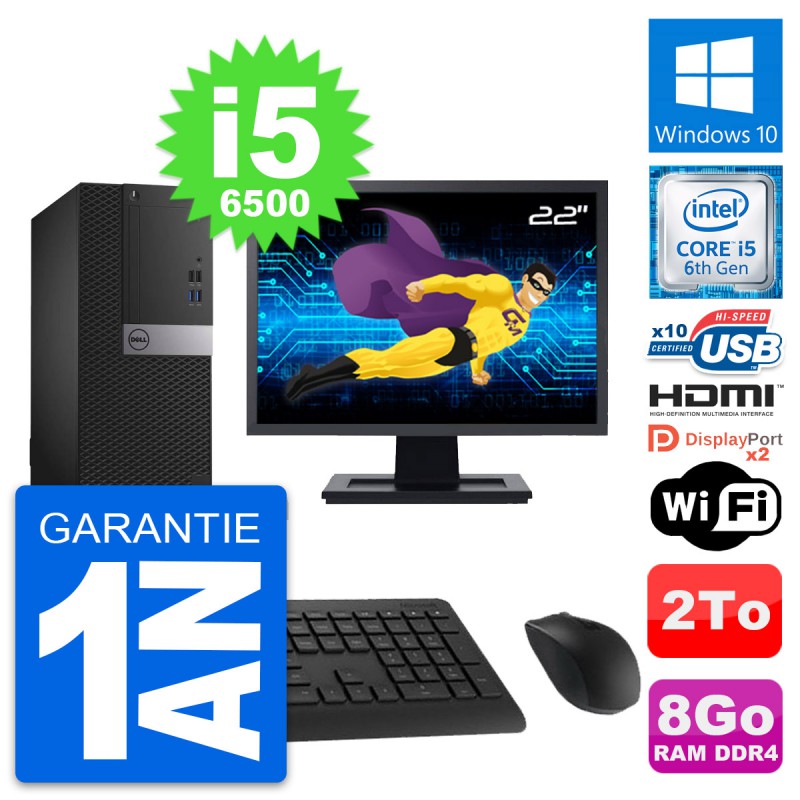 PC Tour Dell OptiPlex 5050 MT - Intel Core i5-6500 3.2 Ghz (6 Mo) - 8 Go DDR4 - Disque Dur 3,5" 2 To - Clef Wifi USB - Windows 10 - Livré avec Ecran 22" + clavier + souris (Marques et modèles variables) - Garantie 1 an.