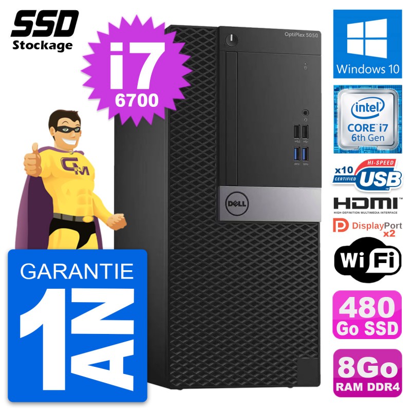 PC Tour Dell OptiPlex 5050 MT - Intel Core i7-6700 3.4 Ghz (8 Mo) - 8 Go DDR4 - SSD 480 Go - Clef Wifi USB - Windows 10 - Garantie 1 an.
