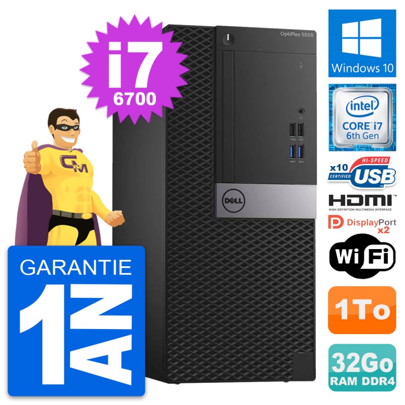 PC Tour Dell OptiPlex 5050 MT - Intel Core i7-6700 3.4 Ghz (8 Mo) - 32 Go DDR4 - Disque Dur 3,5" 1 To - Clef Wifi USB - Windows 10 - Garantie 1 an.