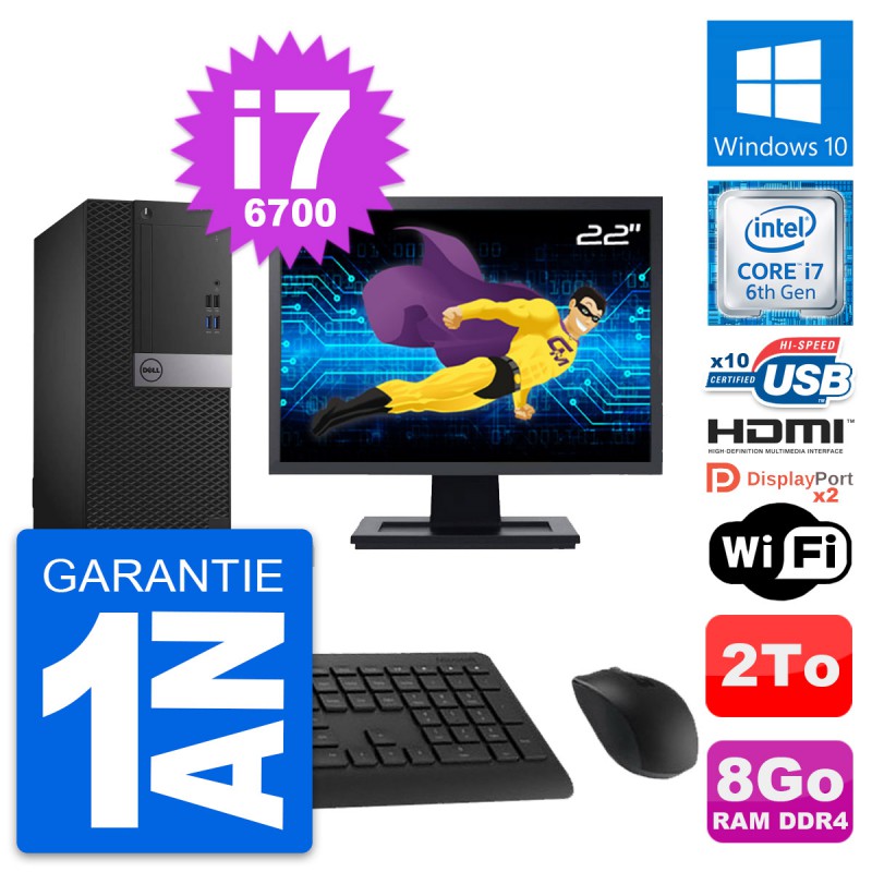 PC Tour Dell OptiPlex 5050 MT - Intel Core i7-6700 3.4 Ghz (8 Mo) - 8 Go DDR4 - Disque Dur 3,5" 2 To - Clef Wifi USB - Windows 10 - Livré avec Ecran 22" + clavier + souris (Marques et modèles variables) - Garantie 1 an.