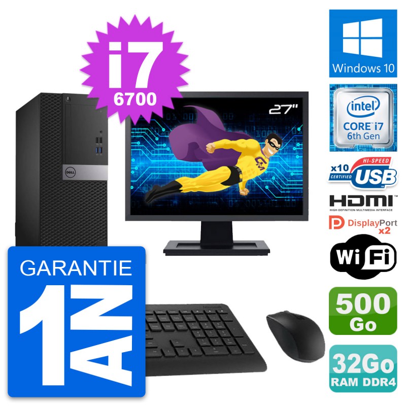 PC Tour Dell OptiPlex 5050 MT - Intel Core i7-6700 3.4 Ghz (8 Mo) - 32 Go DDR4 - Disque Dur 3,5" 500 Go - Clef Wifi USB - Windows 10 - Livré avec Ecran 27" + clavier + souris (Marques et modèles variables) - Garantie 1 an.