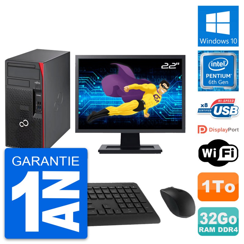 PC Tour Fujitsu Esprimo P557 MT - Intel Pentium Dual-Core G4400 3.3 Ghz (3 Mo) - 32 Go DDR4 - Disque Dur 3,5" 1 To - Clef Wifi USB - Windows 10 - Livré avec Ecran 22" + clavier + souris (Marques et modèles variables) - Garantie 1 an.