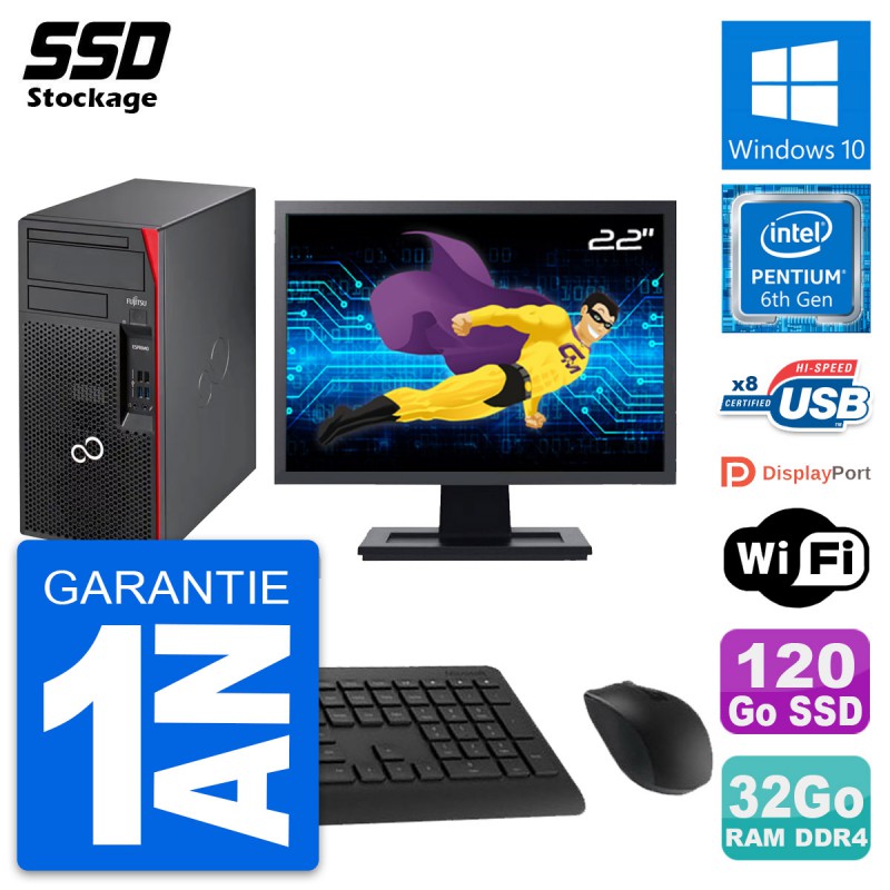 PC Tour Fujitsu Esprimo P557 MT - Intel Pentium Dual-Core G4400 3.3 Ghz (3 Mo) - 32 Go DDR4 - SSD 120 Go - Clef Wifi USB - Windows 10 - Livré avec Ecran 22" + clavier + souris (Marques et modèles variables) - Garantie 1 an.