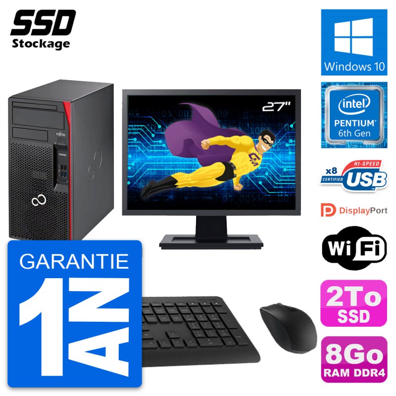 PC Tour Fujitsu Esprimo P557 MT - Intel Pentium Dual-Core G4400 3.3 Ghz (3 Mo) - 8 Go DDR4 - SSD 2 To - Clef Wifi USB - Windows 10 - Livré avec Ecran 27" + clavier + souris (Marques et modèles variables) - Garantie 1 an.