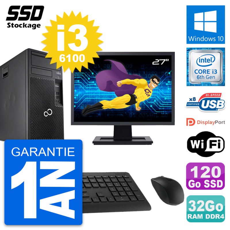 PC Tour Fujitsu Esprimo P557 MT - Intel Core i3-6100 3.7 Ghz (3 Mo) - 32 Go DDR4 - SSD 120 Go - Clef Wifi USB - Windows 10 - Livré avec Ecran 27" + clavier + souris (Marques et modèles variables) - Garantie 1 an.