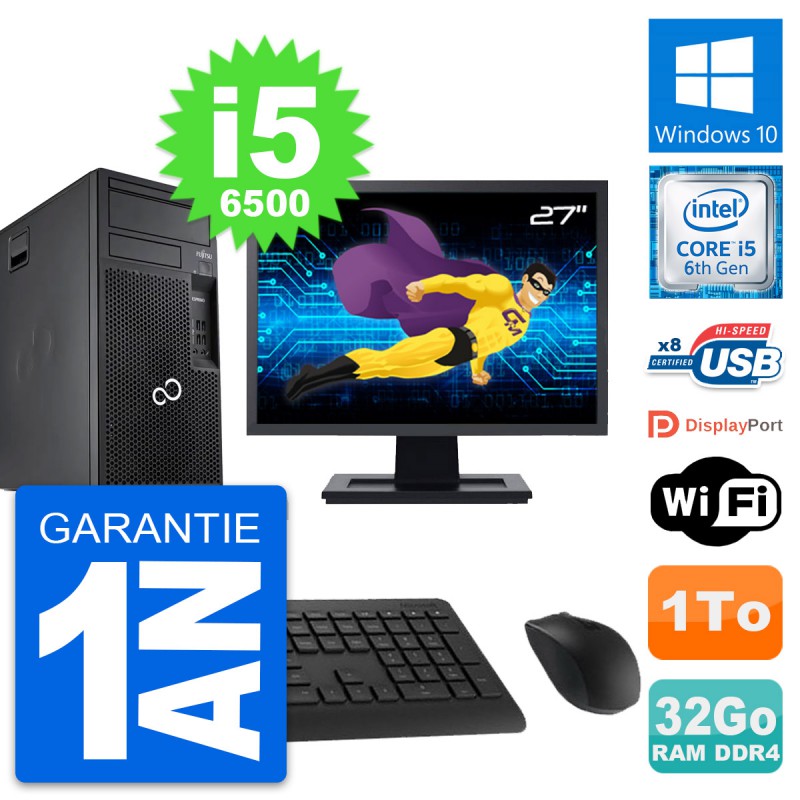PC Tour Fujitsu Esprimo P557 MT - Intel Core i5-6500 3.2 Ghz (6 Mo) - 32 Go DDR4 - Disque Dur 3,5" 1 To - Clef Wifi USB - Windows 10 - Livré avec Ecran 27" + clavier + souris (Marques et modèles variables) - Garantie 1 an.