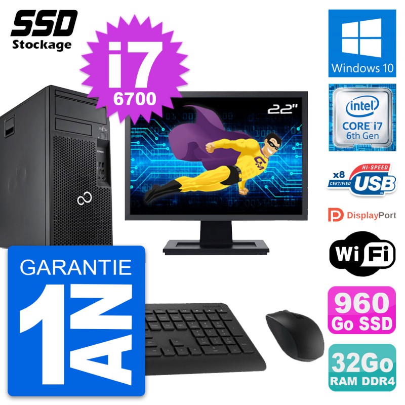 PC Tour Fujitsu Esprimo P557 MT - Intel Core i7-6700 3.4 Ghz (8 Mo) - 32 Go DDR4 - SSD 960 Go - Clef Wifi USB - Windows 10 - Livré avec Ecran 22" + clavier + souris (Marques et modèles variables) - Garantie 1 an.