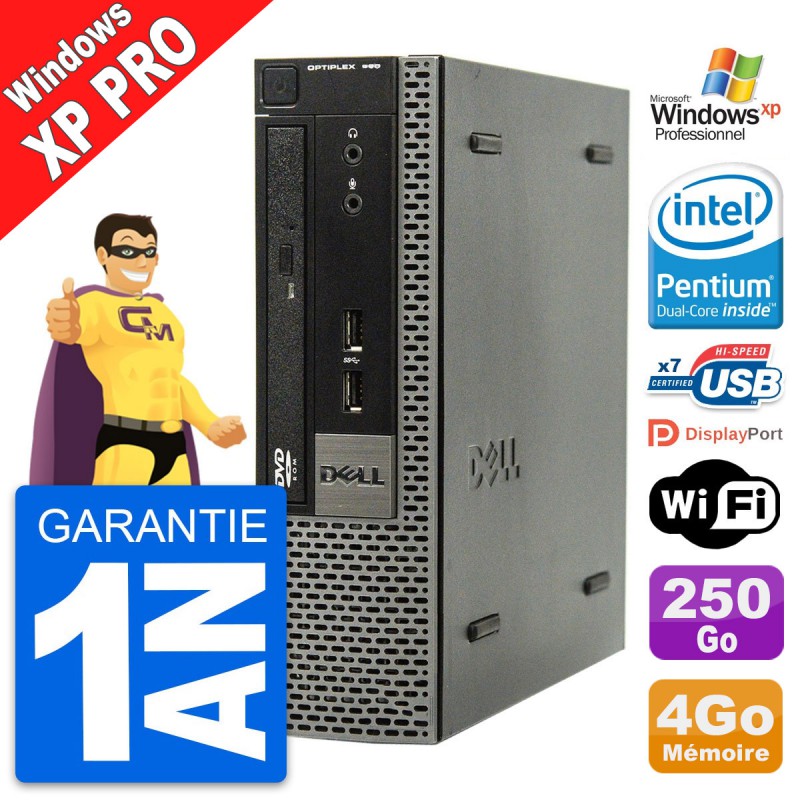 Mini PC Dell OptiPlex 990 USFF - Intel Pentium Dual-Core G630 2.7 Ghz (3 Mo) - 4 Go DDR3 - Disque Dur 2,5" 250 Go - Graveur DVD - Clef Wifi USB - Windows XP Professionnel - Garantie 1 an.