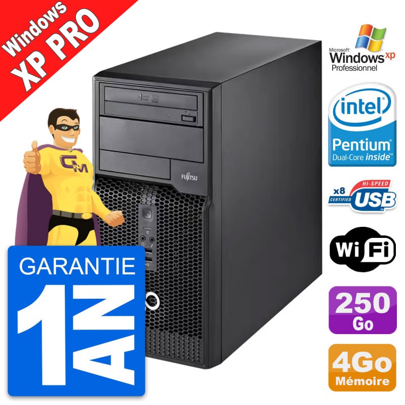 PC Tour Fujitsu Esprimo P510 MT - Intel Pentium Dual-Core G2020 2.9 Ghz (3 Mo) - 4 Go DDR3 - Disque Dur 3,5" 250 Go - Graveur DVD - Clef Wifi USB - Windows XP Professionnel - Garantie 1 an.