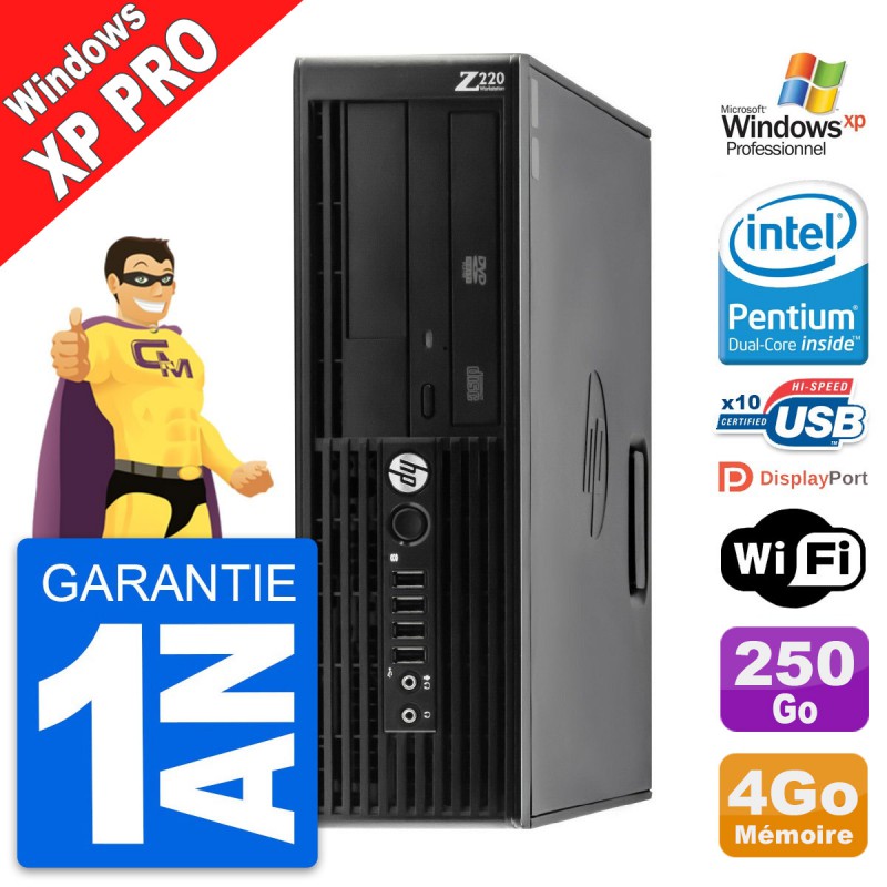 PC HP WorkStation Z220 SFF - Intel Pentium Dual-Core G2020 2.9 Ghz (3 Mo) - 4 Go DDR3 - Disque Dur 3,5" 250 Go - Graveur DVD - Clef Wifi USB - Windows XP Professionnel - Garantie 1 an.