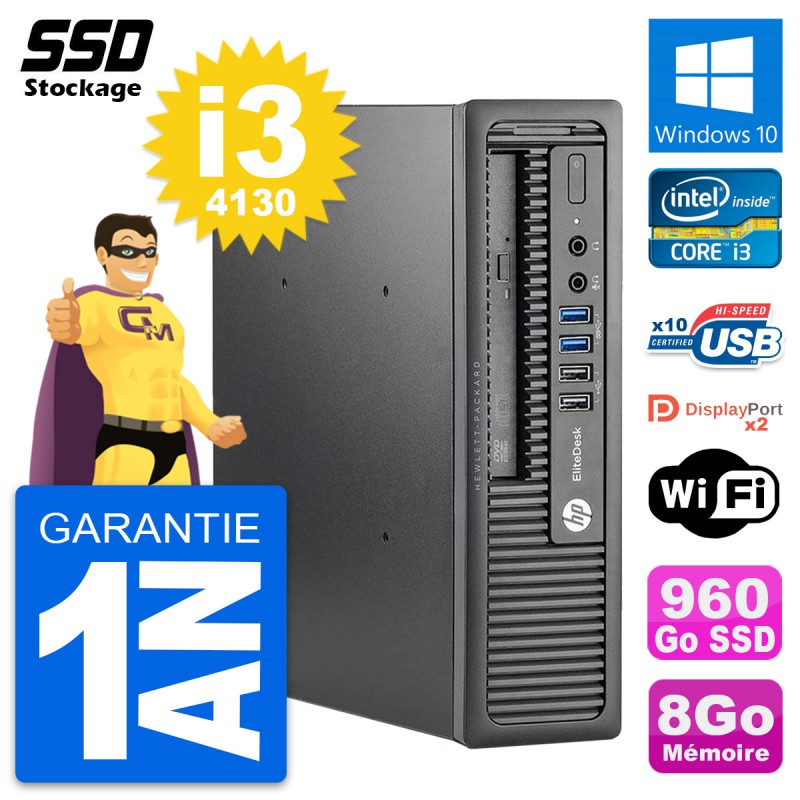 Mini PC HP EliteDesk 800 G1 USDT - Intel Core i3-4130 3.4 Ghz (3 Mo) - 8 Go DDR3 - SSD 960 Go - Graveur DVD - Clef Wifi USB - Windows 10 - Garantie 1 an.