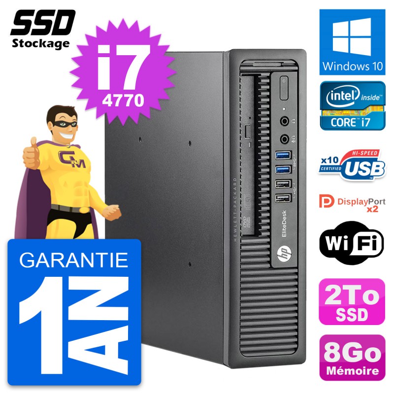 Mini PC HP EliteDesk 800 G1 USDT - Intel Core i7-4770 3.4 Ghz (8 Mo) - 8 Go DDR3 - SSD 2To - Graveur DVD - Clef Wifi USB - Windows 10 - Garantie 1 an.