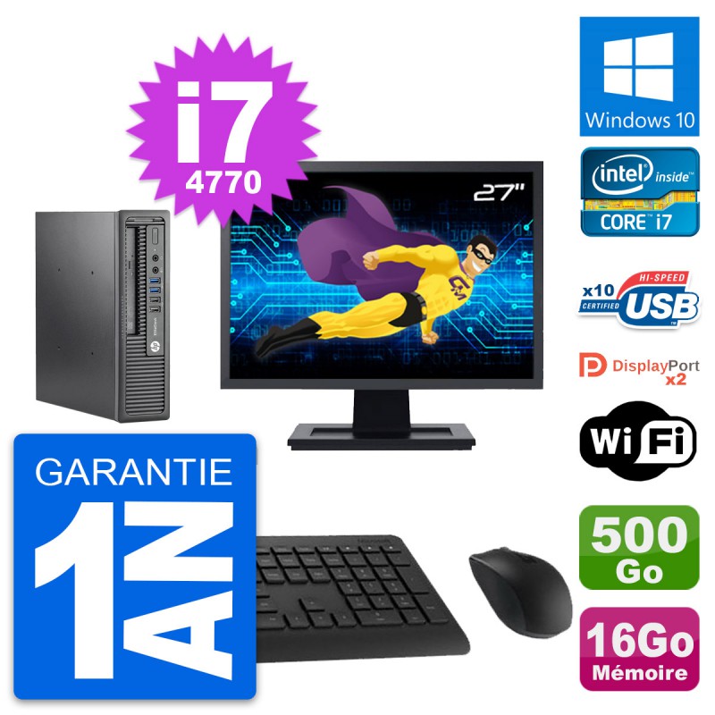 Mini PC HP 800 G1 USDT - Intel Core i7-4770 3.4 Ghz (8 Mo) - 16 Go DDR3 - Disque Dur 2,5" 500 Go - Graveur DVD - Clef Wifi USB - Windows 10 - Livré avec Ecran 27" + clavier + souris (Marques et modèles variables) - Garantie 1 an.