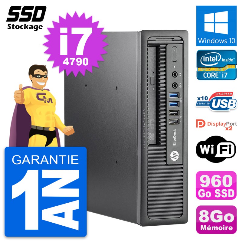Mini PC HP EliteDesk 800 G1 USDT - Intel Core i7-4790 3.6 Ghz (8 Mo) - 8 Go DDR3 - SSD 960 Go - Graveur DVD - Clef Wifi USB - Windows 10 - Garantie 1 an.