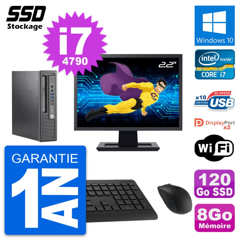 Mini PC HP 800 G1 USDT - Intel Core i7-4790 3.6 Ghz (8 Mo) - 8 Go DDR3 - SSD 120 Go - Graveur DVD - Clef Wifi USB - Windows 10 - Livré avec Ecran 22" + clavier + souris (Marques et modèles variables) - Garantie 1 an.