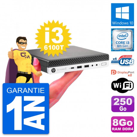 Mini PC HP EliteDesk 800 G3 DM - Intel Core i3-6100T 3.2 Ghz (3 Mo) - 8 Go DDR4 - Disque Dur 2,5" 250 Go - Clef Wifi USB - Windows 10 - Garantie 1 an.