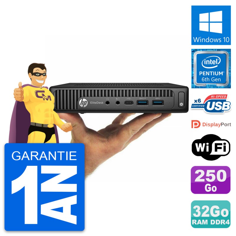 Ultra Mini PC HP EliteDesk 800 G2 DM - Intel Pentium Dual-Core G4400T 2.9 Ghz (3 Mo) - 32 Go DDR4 - Disque Dur 2,5" 250 Go - Clef Wifi USB - Windows 10 - Garantie 1 an.