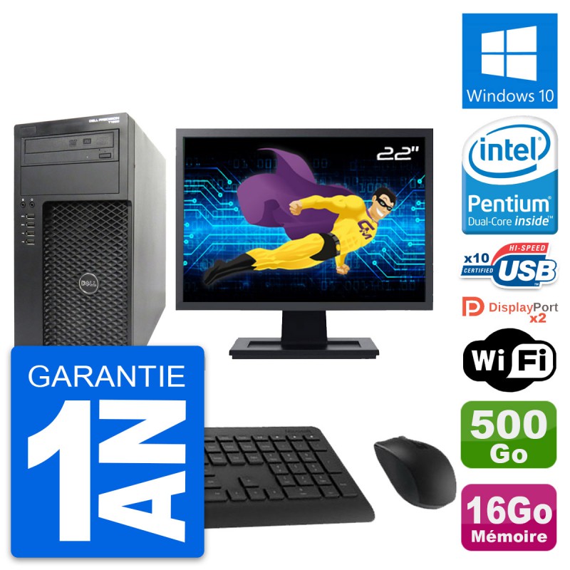 PC Tour Dell Precision T1650 MT - Intel Pentium Dual-Core G2020 2.9 Ghz (3 Mo) - 16 Go DDR3 - Disque Dur 3,5" 500 Go - Graveur DVD - Clef Wifi USB - Windows 10 - Pack Clavier + Souris + Ecran 22" (Marque et modèle selon arrivages) - Garantie 1 an.