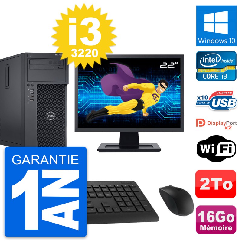 PC Tour Dell Precision T1650 MT - Intel Core i3-3220 3.3 Ghz (3 Mo) - 16 Go DDR3 - Disque Dur 3,5" 2 To - Graveur DVD - Clef Wifi USB - Windows 10 - Pack Clavier + Souris + Ecran 22" (Marque et modèle selon arrivages) - Garantie 1 an.