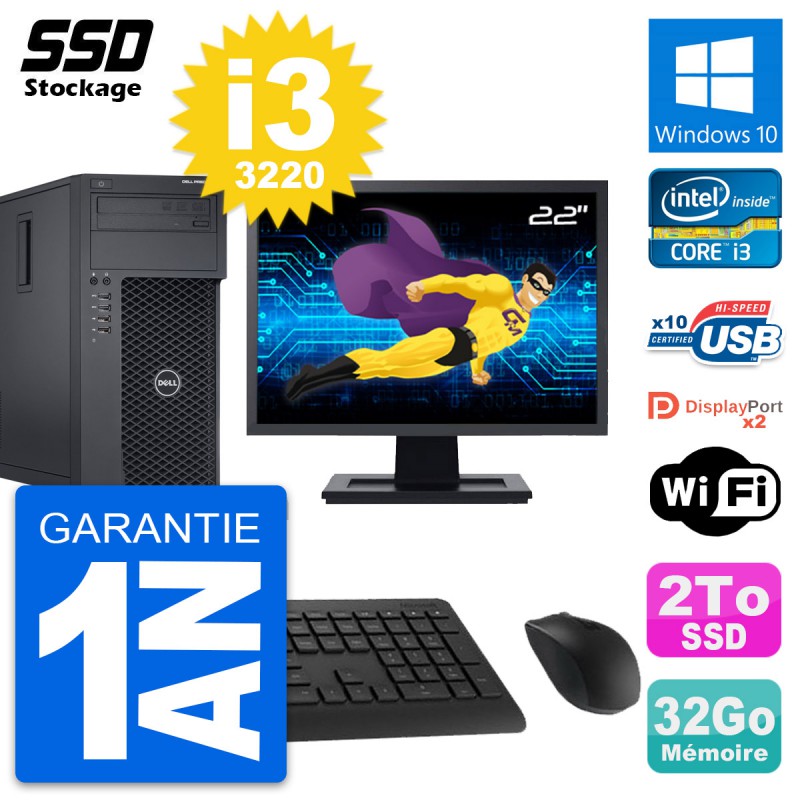 PC Tour Dell Precision T1650 MT - Intel Core i3-3220 3.3 Ghz (3 Mo) - 32 Go DDR3 - SSD 2 To - Graveur DVD - Clef Wifi USB - Windows 10 - Pack Clavier + Souris + Ecran 22" (Marque et modèle selon arrivages) - Garantie 1 an.