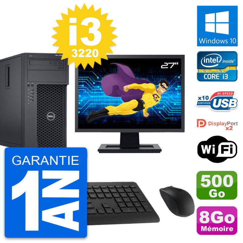 PC Tour Dell Precision T1650 MT - Intel Core i3-3220 3.3 Ghz (3 Mo) - 8 Go DDR3 - Disque Dur 3,5" 500 Go - Graveur DVD - Clef Wifi USB - Windows 10 - Pack Clavier + Souris + Ecran 27" (Marque et modèle selon arrivages) - Garantie 1 an.
