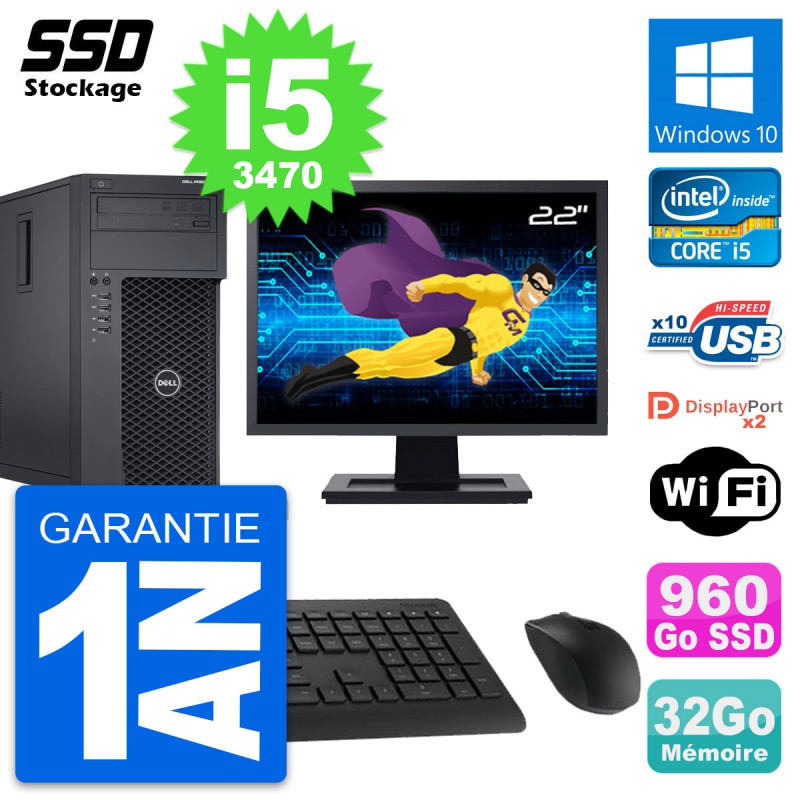 PC Tour Dell Precision T1650 MT - Intel Core i5-3470 3.2 Ghz (6 Mo) - 32 Go DDR3 - SSD 960 Go - Graveur DVD - Clef Wifi USB - Windows 10 - Pack Clavier + Souris + Ecran 22" (Marque et modèle selon arrivages) - Garantie 1 an.