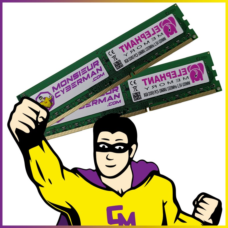 Lot de 2 Modules Mémoires RAM pour PC de Bureau - Elephant Memory - 2x 8Go - 1333Mhz - PC3-10600U - Double Face - 1.5v - Garantie 12 Mois.
