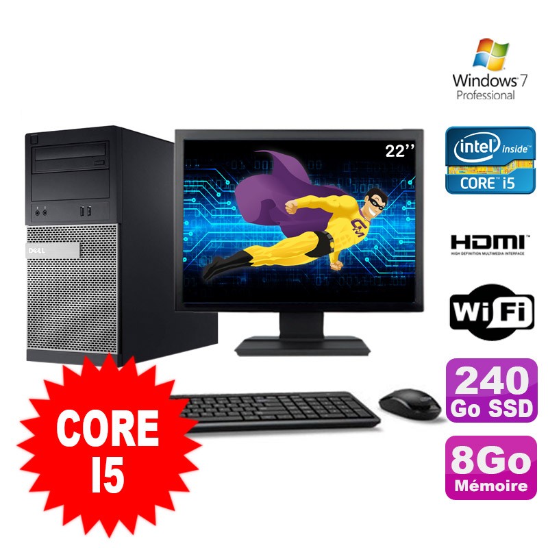 Lot PC Tour DELL 3010 MT I5-2400 Graveur 8Go 240Go SSD HDMI Wifi W7 + Ecran 22"