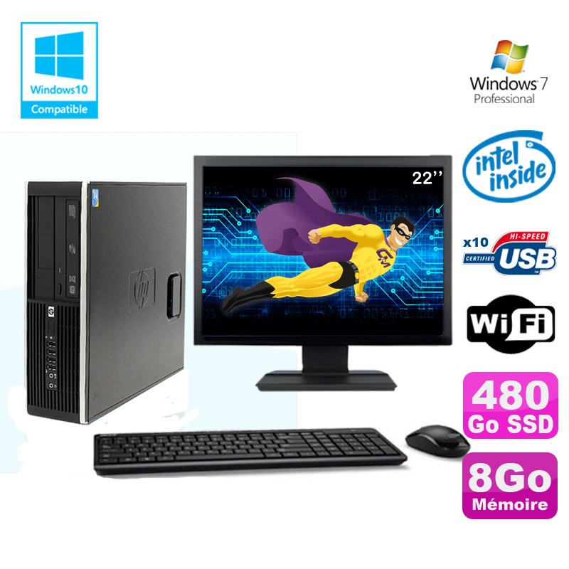 Lot PC HP 8100 SFF G6950 2,8GHz 8Go 480Go SSD Wifi Graveur W7 Pro Ecran 22"