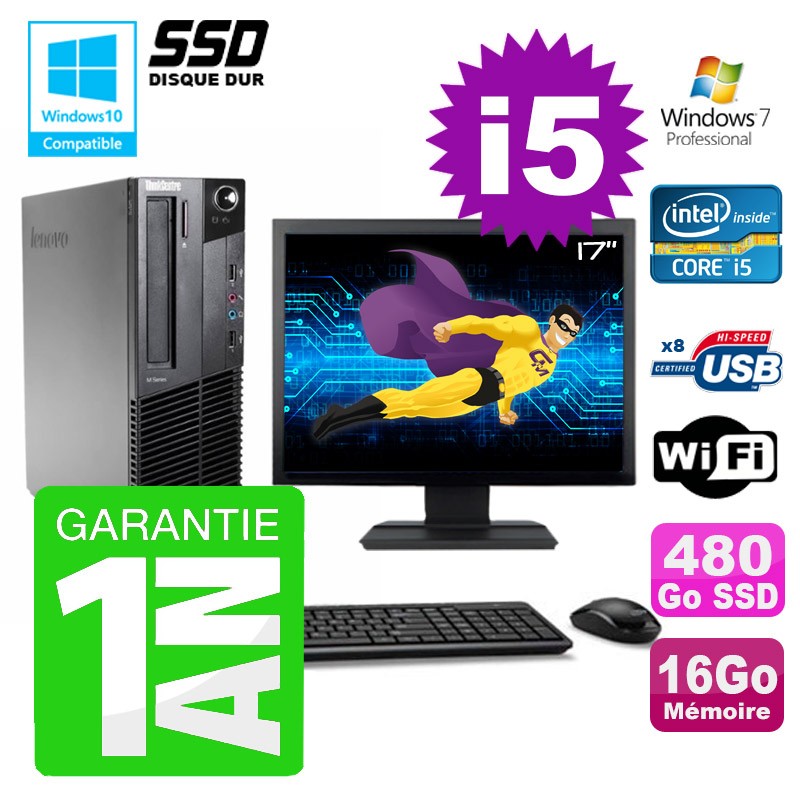 PC Lenovo M91p SFF Intel I5-2400 16Go Disque 480Go SSD Graveur Wifi W7 Ecran 17"