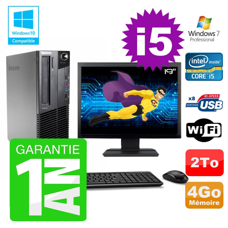 PC Lenovo M91p SFF Intel I5-2400 4Go Disque 2To Graveur Wifi W7 Ecran 19"