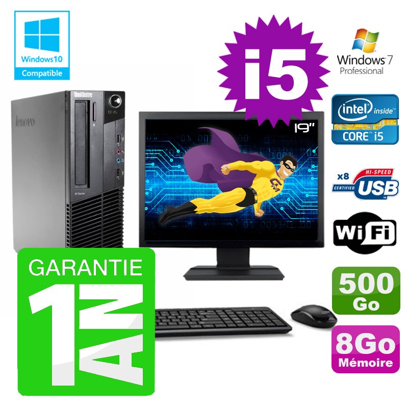 PC Lenovo M91p SFF Intel I5-2400 8Go Disque 500Go Graveur Wifi W7 Ecran 19"