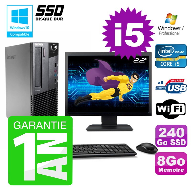 PC Lenovo M91p SFF Intel I5-2400 8Go Disque 240Go SSD Graveur Wifi W7 Ecran 22"