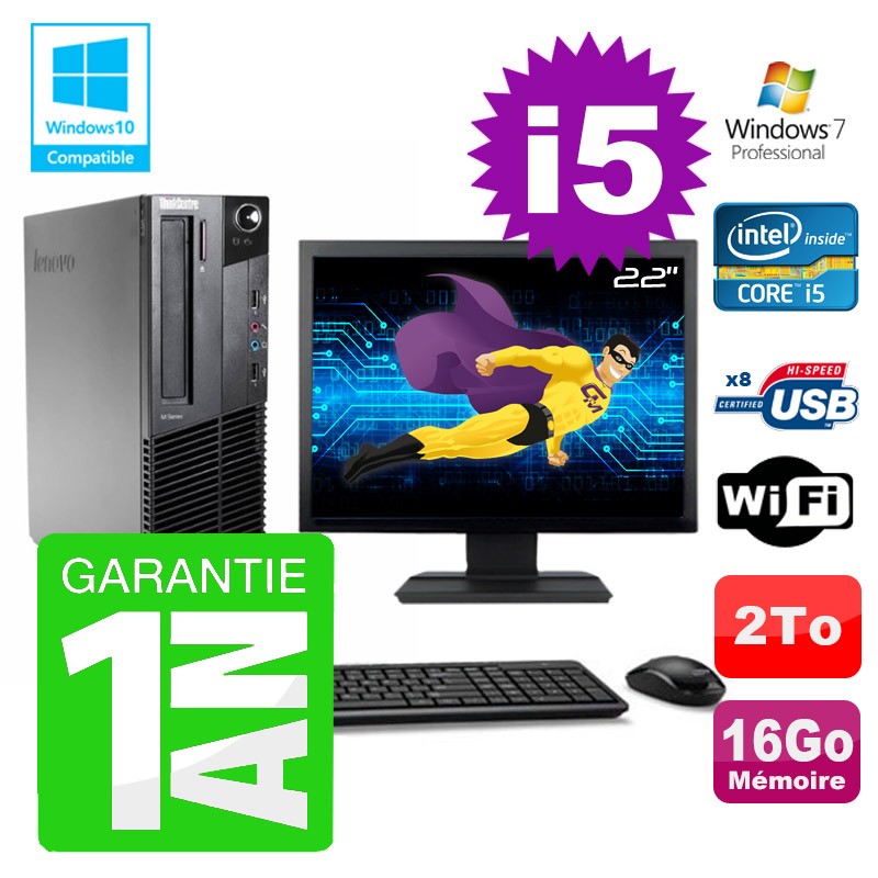 PC Lenovo M91p SFF Intel I5-2400 16Go Disque 2To Graveur Wifi W7 Ecran 22"