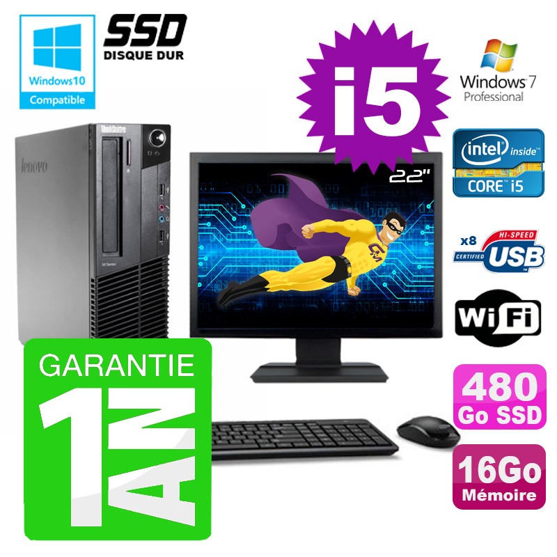 PC Lenovo M91p SFF Intel I5-2400 16Go Disque 480Go SSD Graveur Wifi W7 Ecran 22"