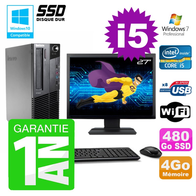 PC Lenovo M91p SFF Intel I5-2400 4Go Disque 480Go SSD Graveur Wifi W7 Ecran 27"