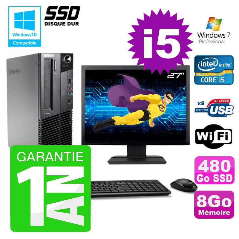 PC Lenovo M91p SFF Intel I5-2400 8Go Disque 480Go SSD Graveur Wifi W7 Ecran 27"