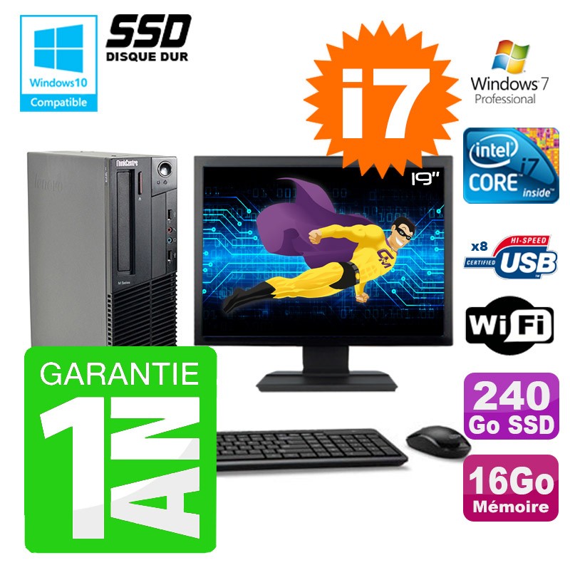 PC Lenovo M91p SFF Intel I7-2600 16Go Disque 240Go SSD Graveur Wifi W7 Ecran 19"