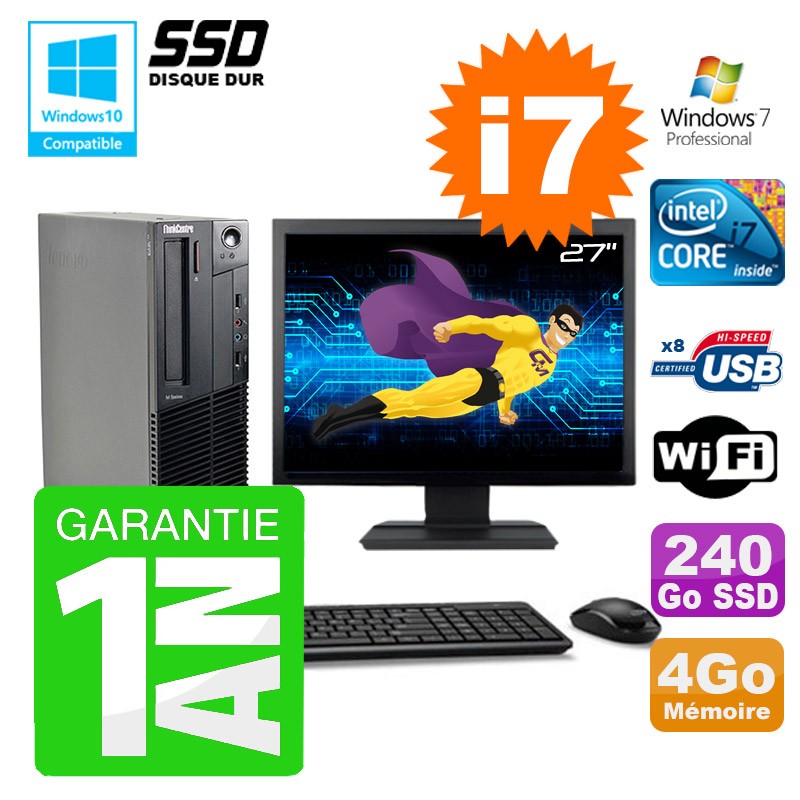PC Lenovo M91p SFF Intel I7-2600 4Go Disque 240Go SSD Graveur Wifi W7 Ecran 27"