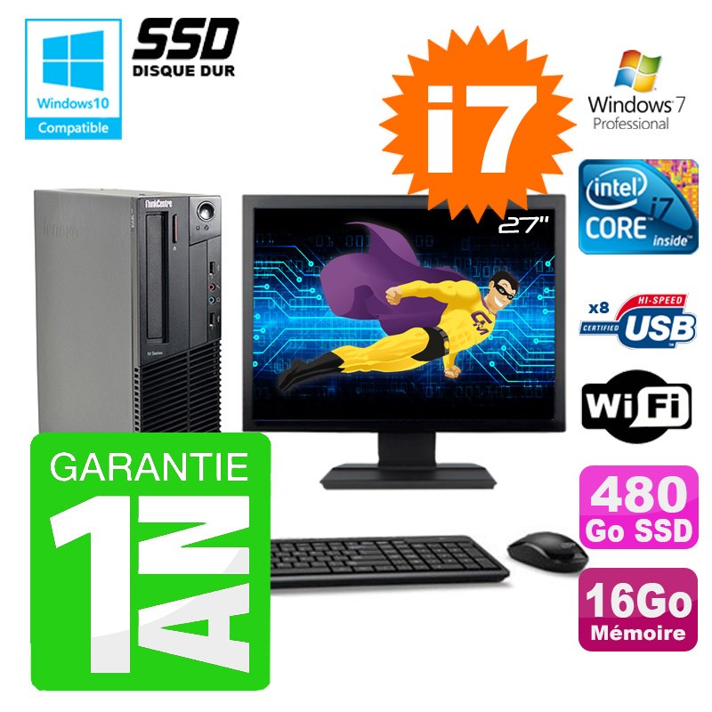 PC Lenovo M91p SFF Intel I7-2600 16Go Disque 480Go SSD Graveur Wifi W7 Ecran 27"