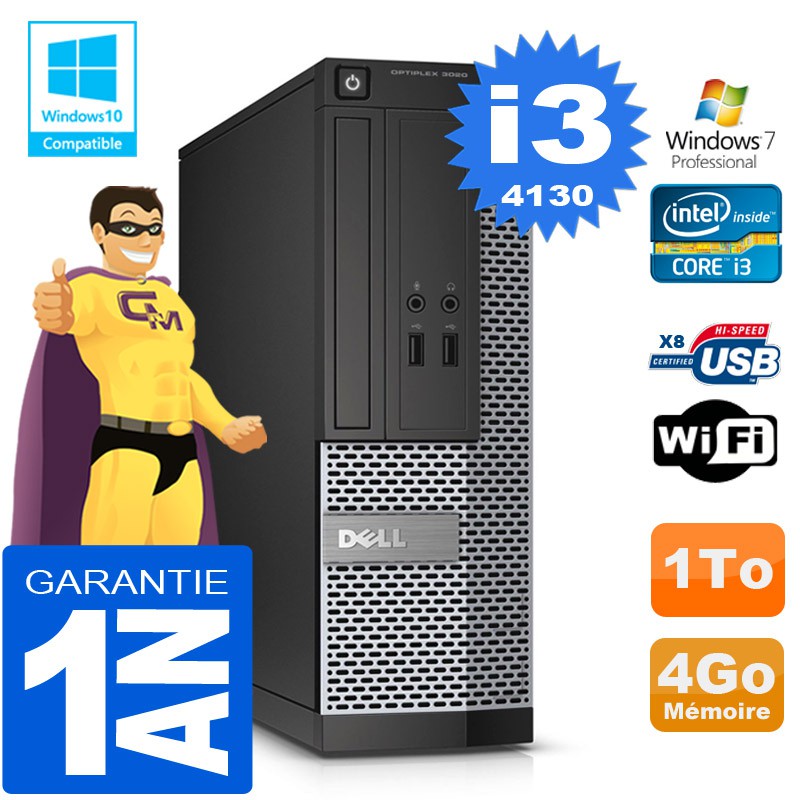 PC DELL 3020 SFF - Intel Core I3-4130 3.4GHz (3 Mo de cache) - 4 Go DDR3 - Disque Dur 1To - Graveur DVD - Clé WIFI USB - Windows 7 Pro - Garantie = 1 an.