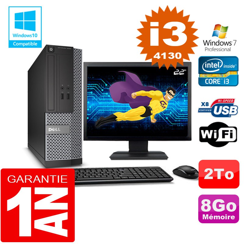 PC DELL 3020 SFF Core I3-4130 Ram 8Go Disque 2 To Wifi W7 Ecran 22"