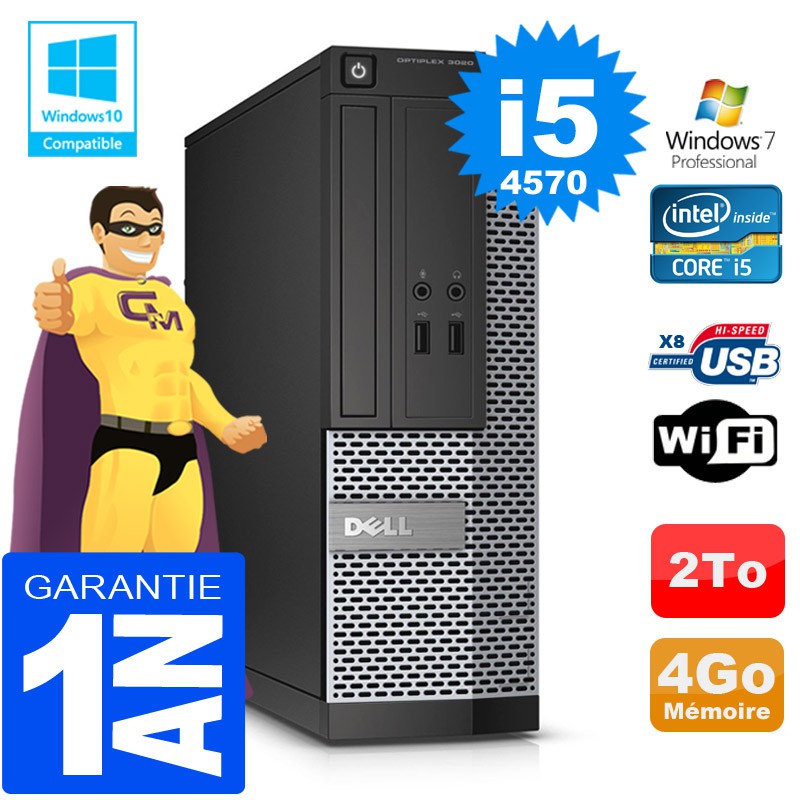 PC DELL 3020 SFF - Intel Core I5-4570 3.2GHz (6 Mo de cache) - 4 Go DDR3 - Disque Dur 2 To - Graveur DVD - Clé WIFI USB - Windows 7 Pro - Garantie = 1 an.