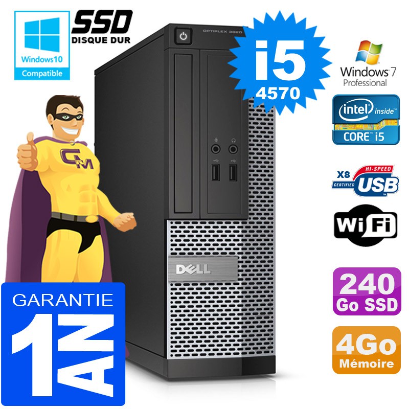 PC DELL 3020 SFF - Intel Core I5-4570 3.2GHz (6 Mo de cache) - 4 Go DDR3 - Disque Dur 240 Go SSD - Graveur DVD - Clé WIFI USB - Windows 7 Pro - Garantie = 1 an.