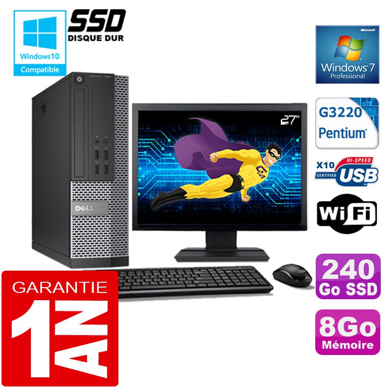PC DELL 7020 SFF - Intel Pentium G3220 3.0GHz (3 Mo de cache) - 8 Go DDR3 - Disque Dur 240 Go SSD - Graveur DVD - Clé WIFI USB - Windows 7 Pro - Pack Clavier + Souris + Ecran 27" ( Marque et modèle selon arrivages) - Garantie = 1 an.