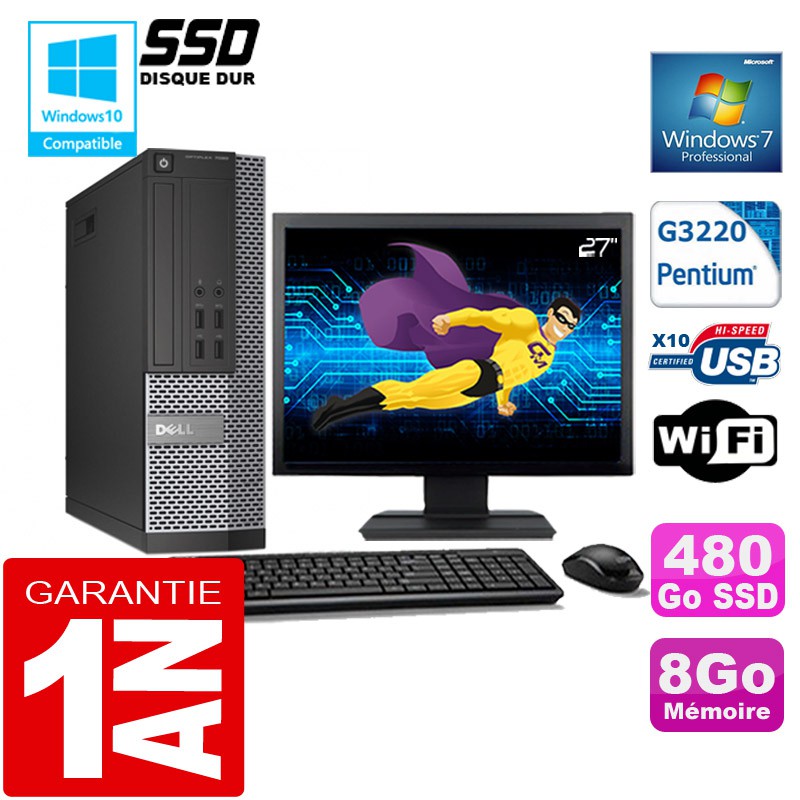 PC DELL 7020 SFF - Intel Pentium G3220 3.0GHz (3 Mo de cache) - 8 Go DDR3 - Disque Dur 480 Go SSD - Graveur DVD - Clé WIFI USB - Windows 7 Pro - Pack Clavier + Souris + Ecran 27" ( Marque et modèle selon arrivages) - Garantie = 1 an.