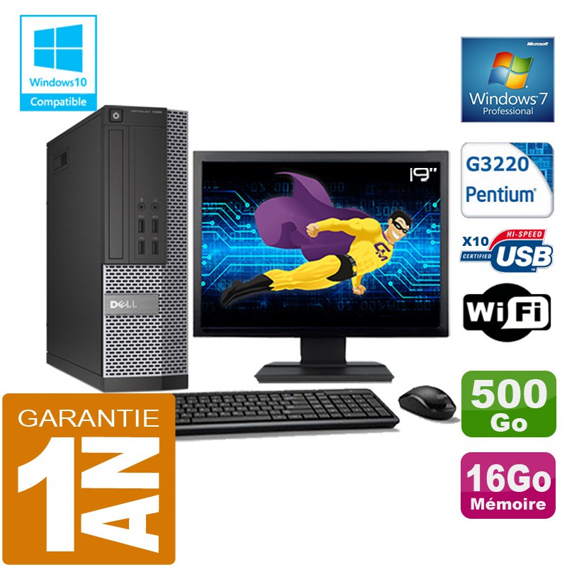 PC DELL 7020 SFF - Intel Pentium G3220 3.0GHz (3 Mo de cache) - 16 Go DDR3 - Disque Dur 500 Go - Graveur DVD - Clé WIFI USB - Windows 7 Pro - Pack Clavier + Souris + Ecran 19" ( Marque et modèle selon arrivages) - Garantie = 1 an.