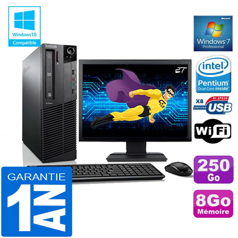 PC Lenovo M92p SFF -Intel Pentium G630 2,7Ghz (3 Mo de cache) - 8Go DDR3 - Disque Dur 250 Go - Graveur DVD - Clé WIFI USB - Windows 7 Pro - Pack Clavier + Souris + Ecran 27" ( Marque et modèle selon arrivages) - Garantie = 1 an.