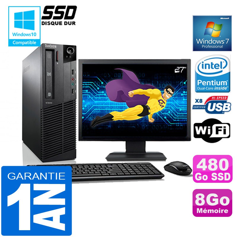 PC Lenovo M92p SFF -Intel Pentium G630 2,7Ghz (3 Mo de cache) - 8Go DDR3 - Disque Dur 480 Go SSD - Graveur DVD - Clé WIFI USB - Windows 7 Pro - Pack Clavier + Souris + Ecran 27" ( Marque et modèle selon arrivages) - Garantie = 1 an.